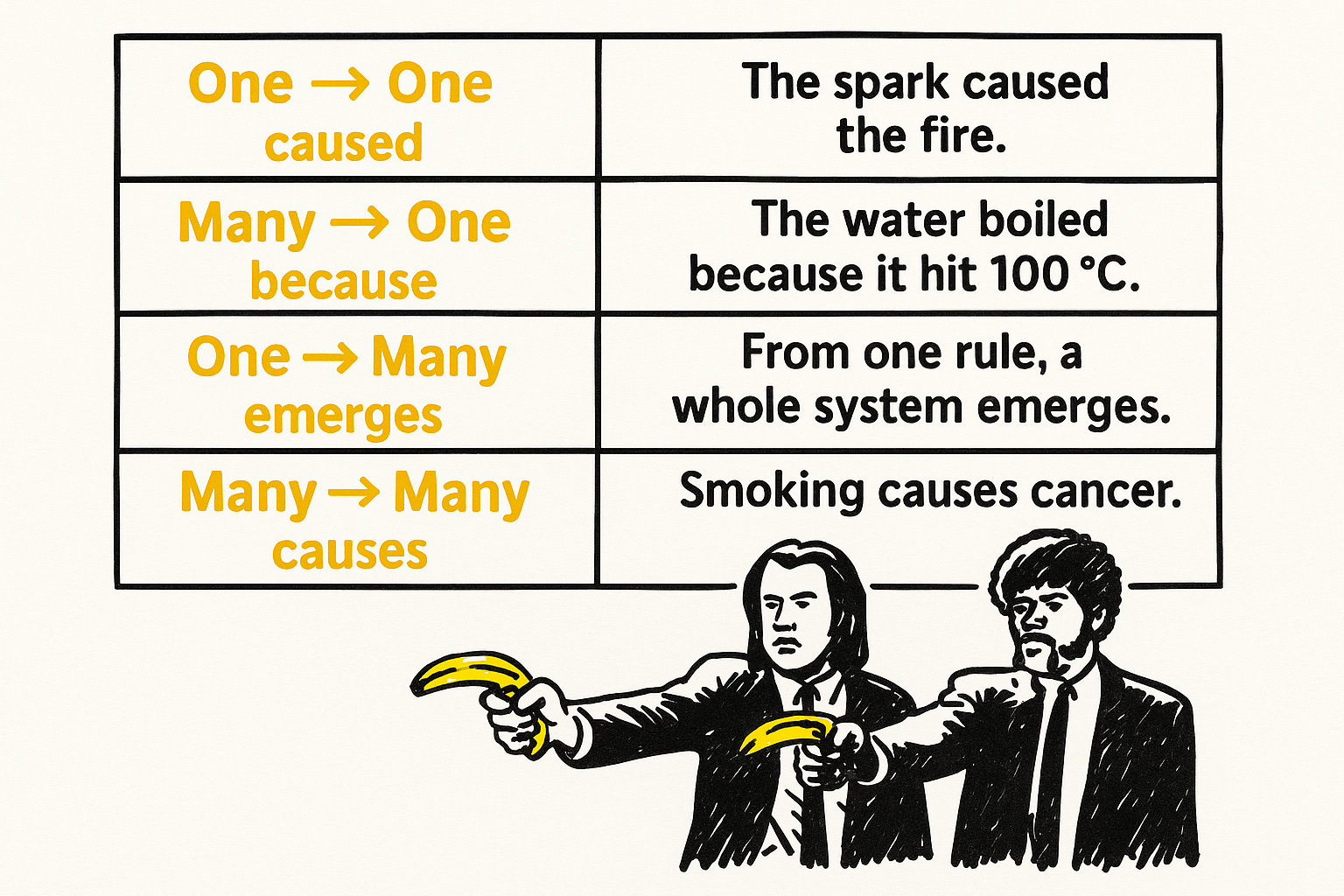 One open question about causation is whether it actually is a coherent single idea at all - this seemingly quasi-mysterious force that makes stuff happen. But the verbs we actually use - “caused,” “because,” “emerges,” and “causes” - suggest to me that there are differences to how causation works. These words don’t just sound different. They point to different structures of sufficiency: different shapes of what counts as “enough” for something to happen.