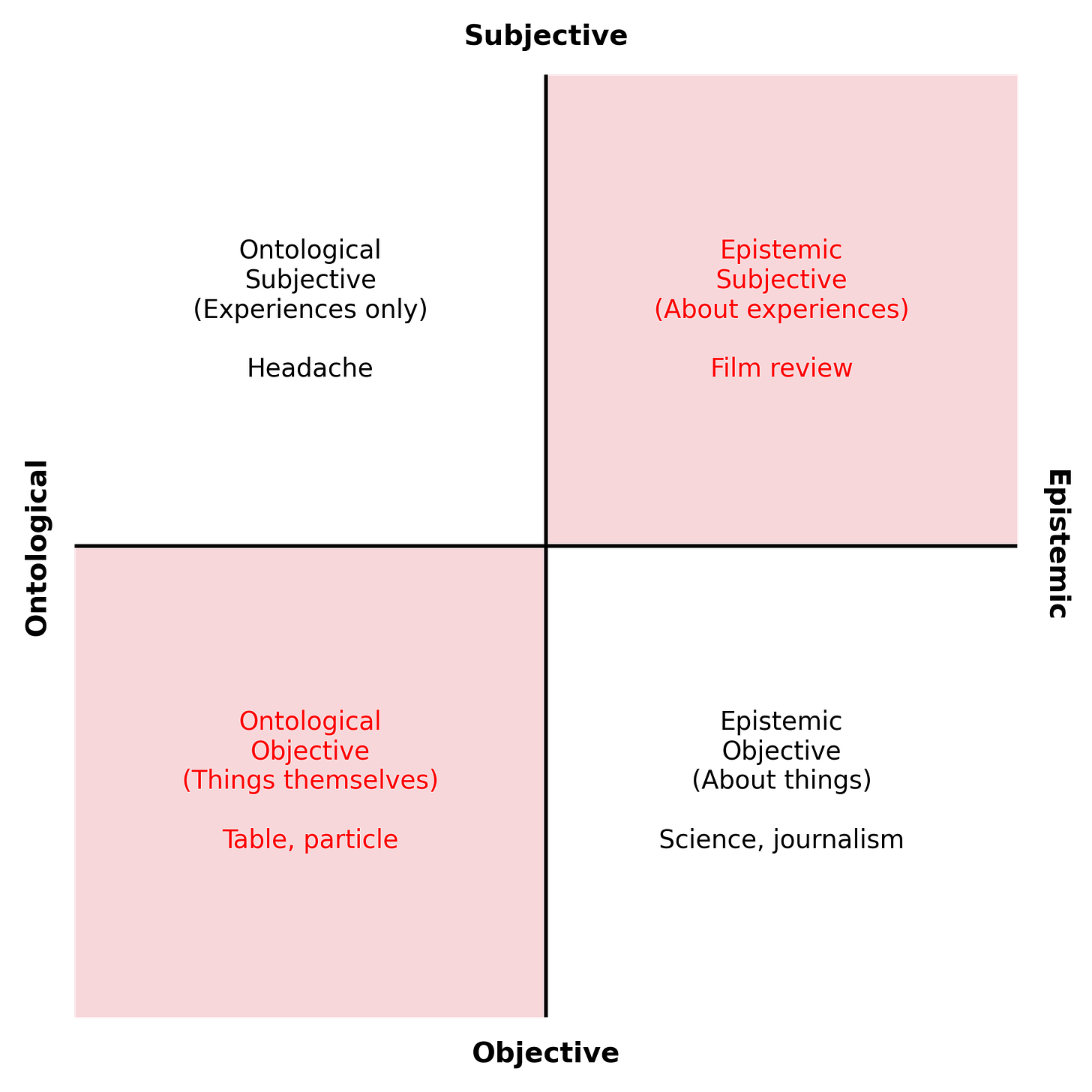 An unbiased article in the New York Times is also objective - but epistemically. It’s not about anyone’s private experience, but about things in the world, carefully cross-checked so that anyone could evaluate the claim.