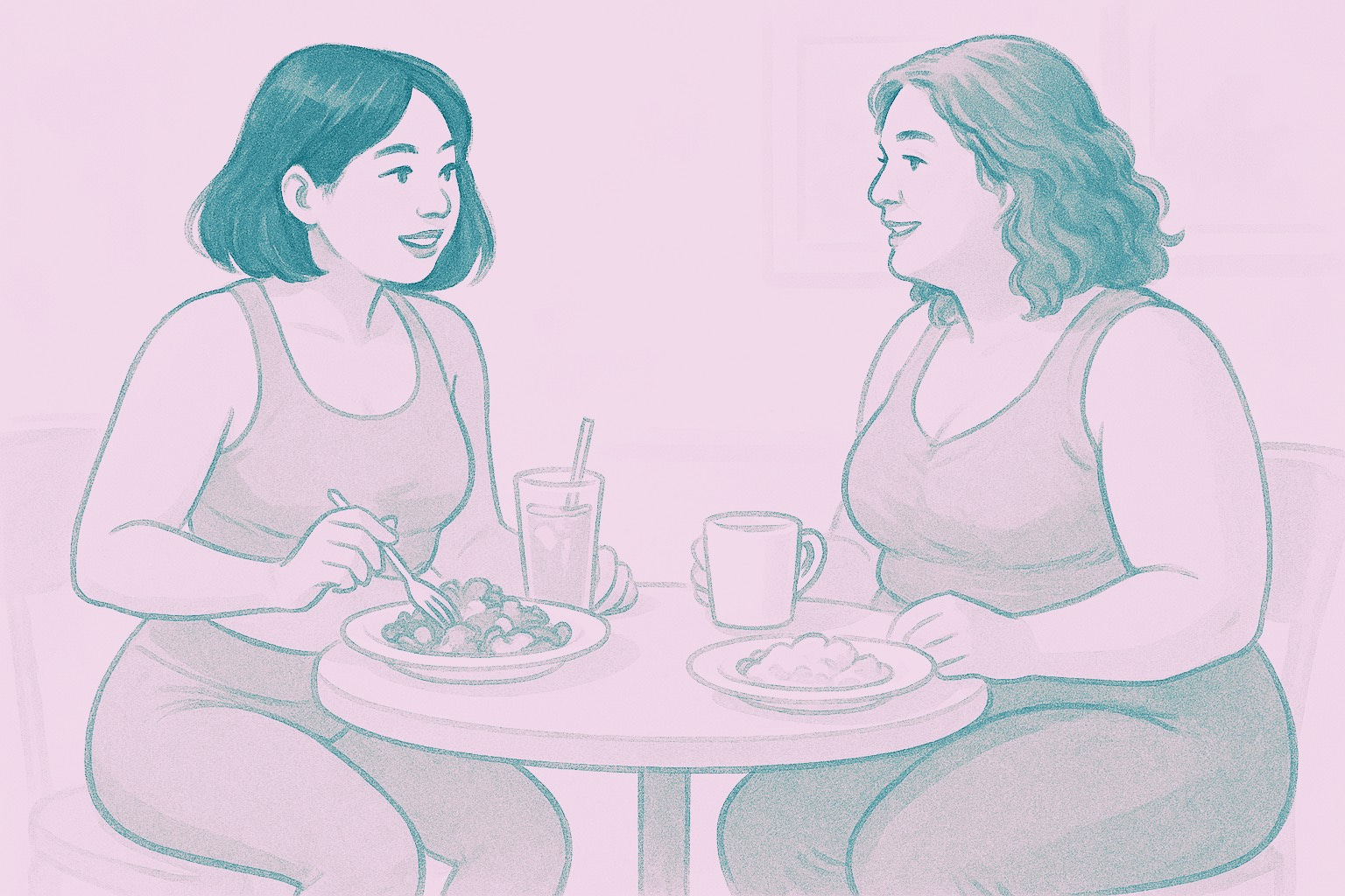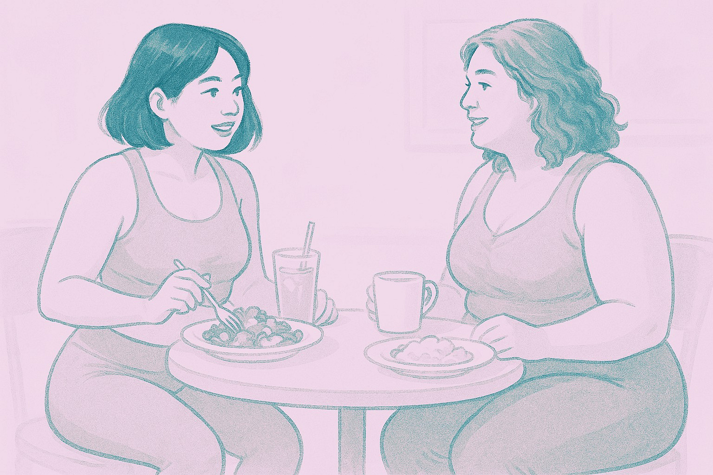 (Same café, but a sunnier day. OLIVIA is in oversized sunglasses and has a tote bag promoting a Genevieve Novak novel slumped beside her. She’s picked a veggie burger and an orange juice. XANTHIPPE has her regular. They settle in — both a little sweatier than usual after a harder pilates session.)